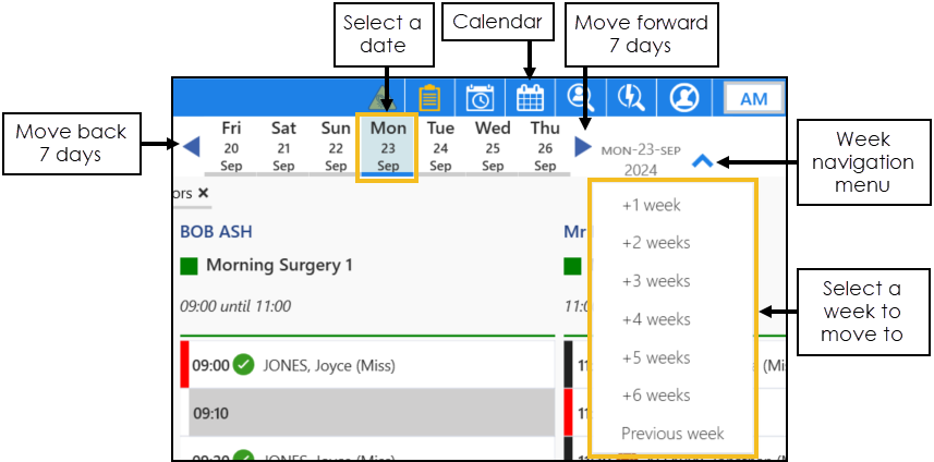 Date Selector - This enables you to pick a date this week, or navigate forwards or backwards by seven days at a time.