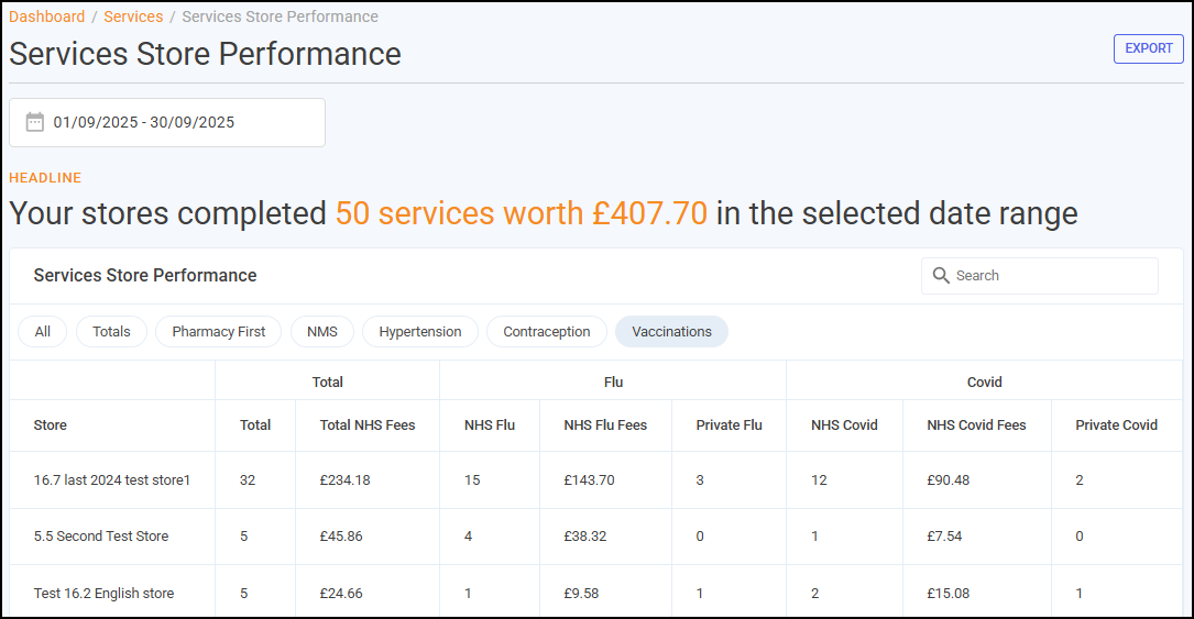 Category - Select from All, Totals, Pharmacy First, NHS Flu, NMS, Hypertension, Contraceptionor Vaccinations.