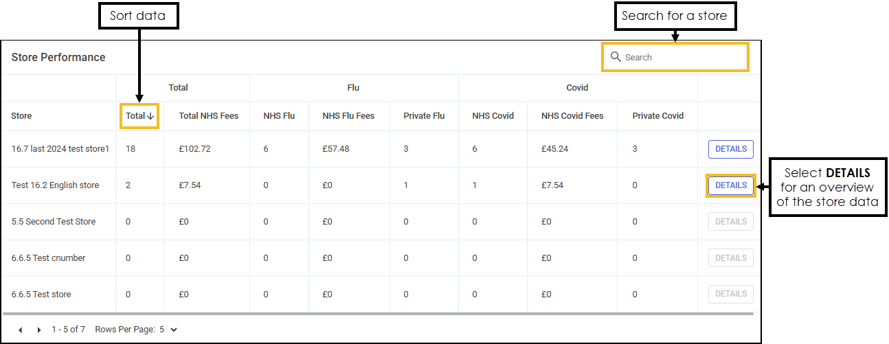 Sort Data - Select any header to sort your pharmacies by the chosen column, for example, select Total to sort pharmacies by the total number of vaccinations administered. You can sort ascending or descending as required.