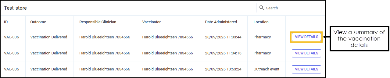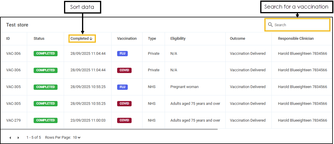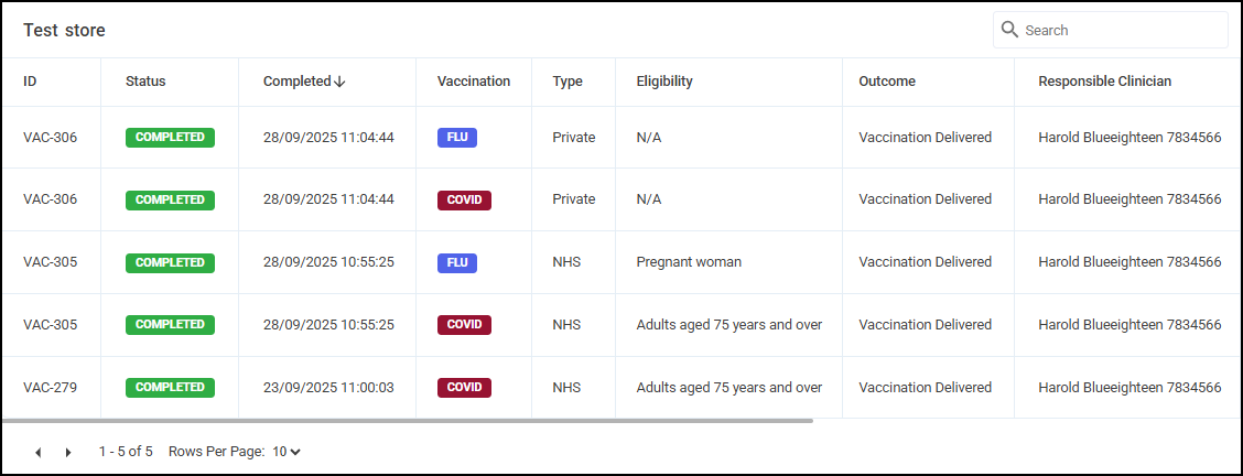 The Vaccinations store table displays details of the completed Flu and Covid vaccinations for the selected store in the set time frame.
