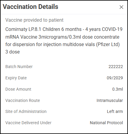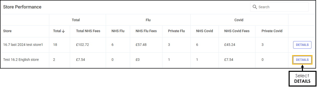 The Vaccinations Store Details screen provides you with an overview of completed NHS and private flu and Covid vaccinations by a specific store within your group.
