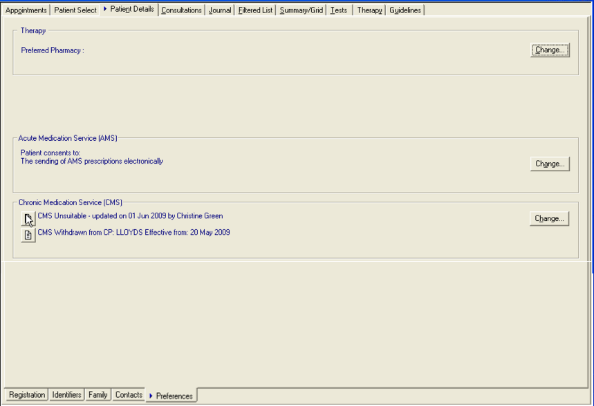 - Patient Details - Preferences - You can also view CMS (Serial Prescribing) registration and suitability status from Patient Details – Preferences in Consultation Manager. If the patient is CMS (Serial Prescribing) Registered, the CMS (Serial Prescribing) Pharmacy is also displayed.