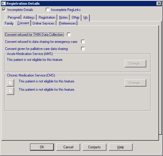 - Registration – Consent - To view the CMS (Serial Prescribing) Registration and Suitability Status from the Registration module, select the patient and select the Consent tab. If the patient is CMS (Serial Prescribing) Registered, the CMS (Serial Prescribing) Pharmacy is also displayed.