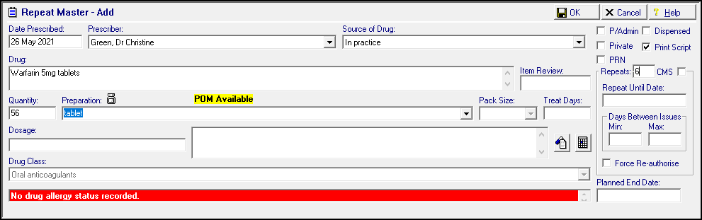 - Print Script - Remove tick to stop this prescription being printed, for example if it had been hand written on a visit and you are recording it.