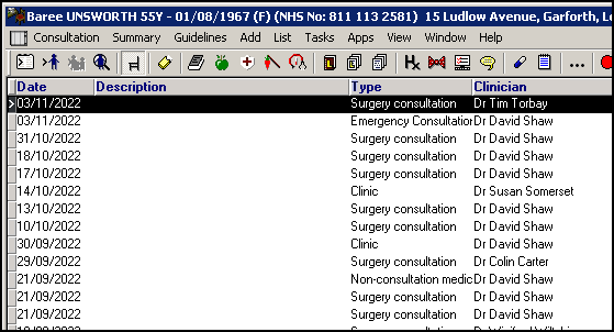 - Highlight the consultation and then select Consultation - Open Existing Consultation to open the consultation (but only if any current consultation is closed). Remember you can always check which consultation is currently open from the information displaying at the bottom of the screen. Select Close Consultation