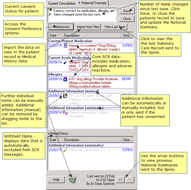 All patients have any additional information automatically included or withheld. Where patients consent to core data only the additional information items are displayed greyed out and are not included in the SCR. Patients who consent to core data and additional information have the items displayed and sent to the NHS Spine: