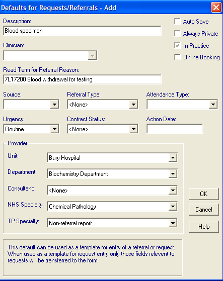- NHS and TP Specialties - These can also be selected now or left blank for entry when the referral is used for a patient. TP Specialty will most like be Pathology. NHS Specialty could be Chemical Pathology, Haematology, Immunopathology, Medical Microbiology etc.