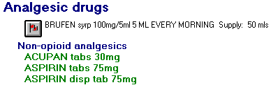 The list will expand to show all the variations of that prescription by age, or sex if a Drug Regime has been set up. The drug headings are in red. Note that drug check flags may be shown.