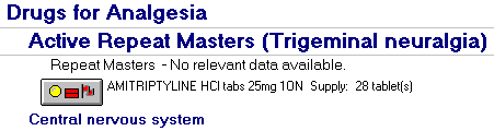 Note - If Show Repeat Masters has been used when creating a new Drug Drug class List, and if the patient has any repeat masters or issues from within the same Drug class, these will be displayed under the heading Active Repeat Masters (Drug class title). A line that starts with the word Repeat is an issue; a line that starts with the drug name is a repeat master. If the message No relevant data available, then this patient has no repeats which fall within the Drug class.