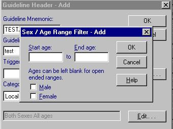 Note - That these are age/sex filters for the entire guideline or plan. (Be aware that if you have a child selected, and you list guidelines, you will only see those related to the age of the child rather than the full list). Later you will be able to filter individual lines of a report with an Age/Sex Filter.
