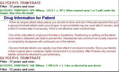 This is drug specific information that can be printed and handed to the patient. For example, for angina attacks, it can advise the patient what to do and when to use the GTN tablet under the tongue. See the section on Print Drug Information for Patient.