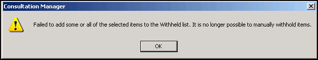 If you attempt to add data to the withheld data pane, the 'Failed to add some or all of the selected items to the Withheld list. It is no longer possible to manually withhold items.' message displays, select OK to close:
