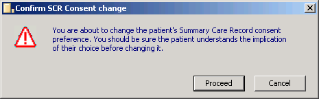- You are prompted "You are about to change the patient's Summary Care Record consent preference. You should be sure the patient understands the implication of their choice before changing it." Click Proceed to change the preference.