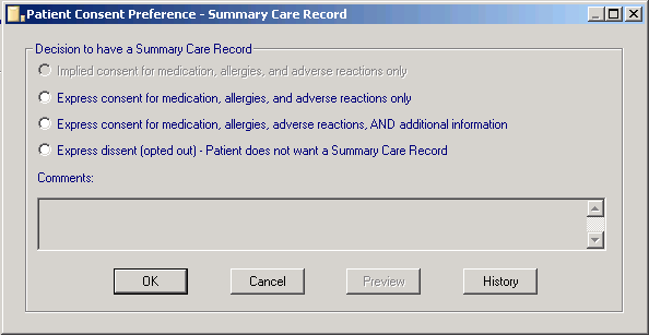 - No Preference Expressed - This displays in Consultation Manager - Patient Details - Preference, or National Summary - Preferences. This is assumed by Vision 3 to be Implied Consent and their SCR includes current repeat medication, current acute medication and all allergies and adverse reactions.