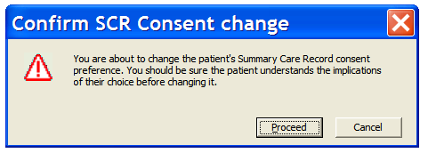 Whenever you add, edit or delete an SCR consent preference via the SCR Consent Preference screen or via a medical history entry, you are prompted with the following warning: