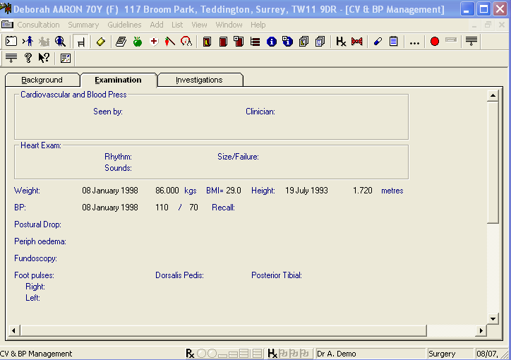 The entries are: Cardiovascular and Blood Press, Heart Examination, Weight, Height, and BP, Postural Drop, Peripheral Oedema, Fundoscopy, Foot pulses right and left.