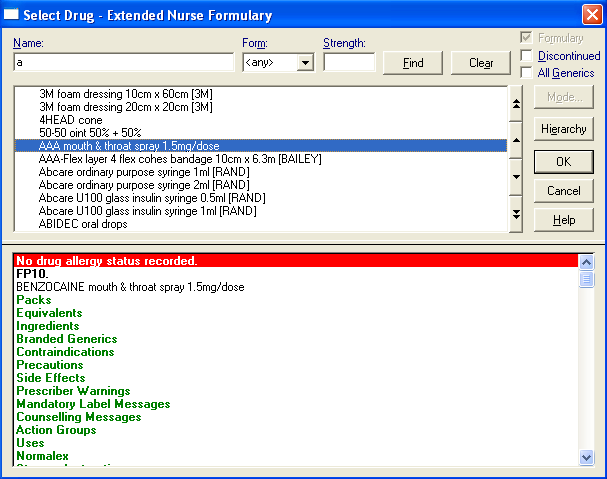 If formulary selection is still being used, when selecting a drug by typing part of the name, the only drugs listed are those contained in the relevant formulary. When pressing F3 to display the back Drug Select screen, note that the Formulary flag is checked and disabled, and the Mode button is disabled.
