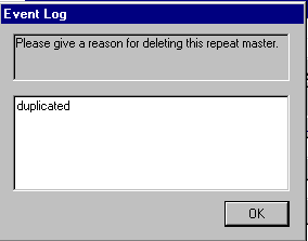 If you are deleting, right click on the Repeat Master line and select Delete. The Repeat Master - Delete screen is shown. Click Delete. Then on the Event Log screen, type in the reason for deleting the repeat, in free text. Click OK.