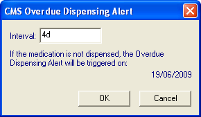 - At the CMS Overdue Dispensing Alert window, enter the time period for which you would like the alert to display in the Interval box. You can enter d for day or m for month. The date the alert is triggered on displays in the bottom right hand corner.