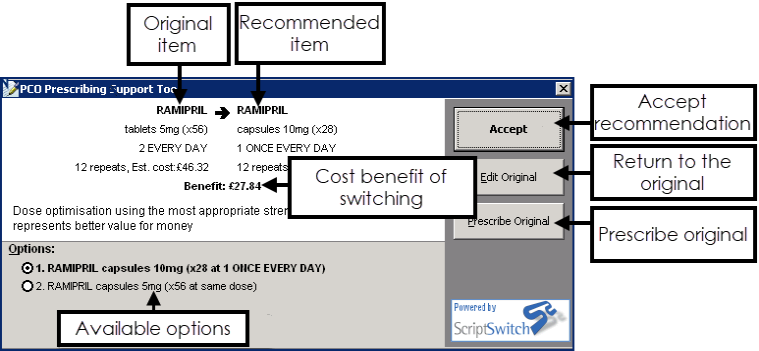 When you click OK on Therapy Add, ScriptSwitch determines whether there are any recommendations for the current drug and displays the screen showing the following:
