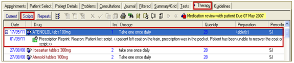 The reason given for the reprint of a prescription displays in Consultation Manager - Therapy - Scripts and in the Journal screen.