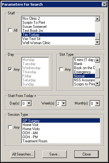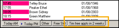 If you create a search for a free slot that you think you will use on a regular basis, for example, a nurse appointment in the next seven days, or an appointment with yourself in 2 weeks time, you can create and save a Free Slot search that then can be a permanent tab on your Consultation Manager - Appointments list.
