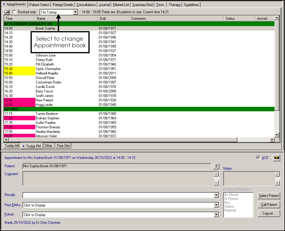 If you are using Cegedim Healthcare Solutions Appointments as your appointments solution and you are logged in to Vision 3 as a clinician with an appointment book, you can display your current appointments session from Consultation Manager.