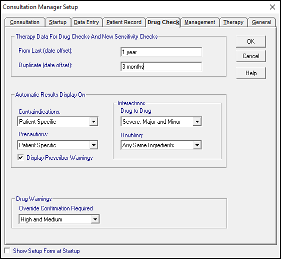 - Show Setup Form at Startup - Tick to show the Consultation Manager Setup form every time you access Consultation Manager. This is particularly useful for administration staff with a varied role within the practice.