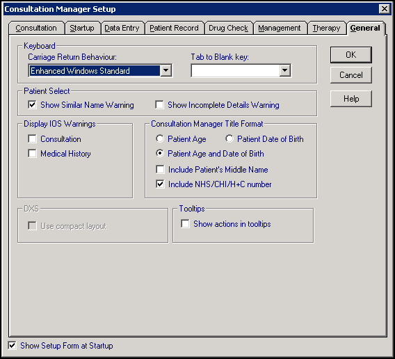 See Consultation Manager Setup - Consultation, Consultation Manager Setup - Start-up, Consultation Manager Setup - Data Entry, Consultation Manager Setup - Patient Record, Consultation Manager Setup - Drug Check, Consultation Manager Setup - Management and Consultation Manager Setup - Therapy for further set up details.
