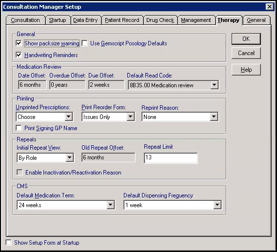 - Tick to show the Consultation Manager Setup form every time you access Consultation Manager. This is particularly useful for administration staff with a varied role within the practice.