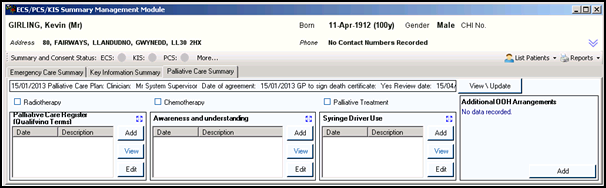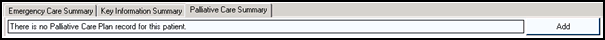 - If there is no plan recorded, 'There is no Palliative Care Plan record for this patient' displays. Select Add to add a record, see Recording an Initial Palliative Care Plan: