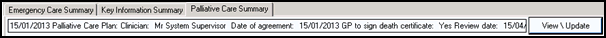 The status of the palliative care plan record displays at the top of the Palliative Care Summary tab: