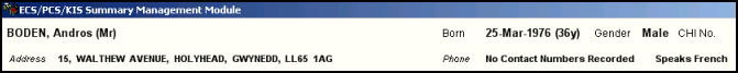 A patient demographic banner displays at the top of the ECS/PCS/KIS Summary Management screen. The banner initially displays the following: