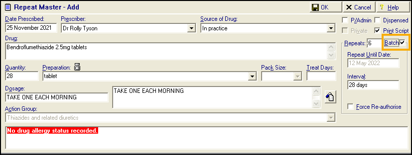 - To turn the Repeat Master into an electronic Repeat Dispensing item, tick Batch: