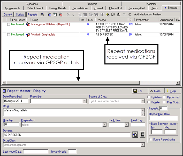 Repeat medication received via GP2GP must be reauthorised before it can be issued, as the originating GP and source are not valid, and you may want to review the repeat drug to ensure it complies with your practice protocol. For this reason, when viewed in Therapy - Repeats, imported repeat medication displays preceded with Prescribed out of Practice .