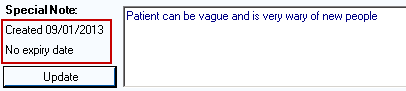 - The date the Special Note is created and the expiry date, if applicable, displays under the Special Note header.