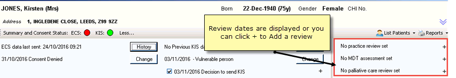 From the Summary and Consent Status section, you can add and update the following review dates:
