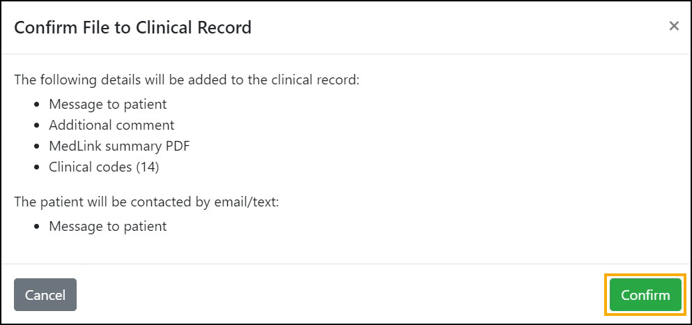 The Confirm File to Clinical Record screen displays summarising the details of what you are about to write back to your clinical system, select Confirm: