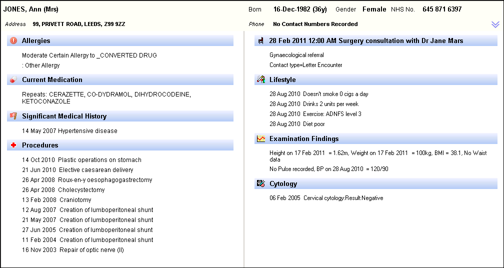 The data displayed is pertinent to a pre-defined set of criteria and takes into account the age and sex of the patient. Some items are displayed on the screen regardless of whether the information is recorded or not, for example, the Allergy is always visible. Other items only show if the patient has the information recorded, for example, Procedures only display if the patient has had an operation or procedure.