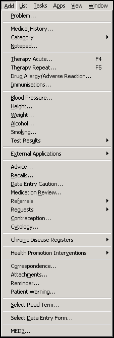 From Consultation Manager, with the patient required selected and a consultation started, select Add and then select the option required: