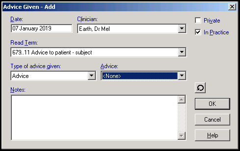 - Read Term- Defaults to 679..11 Advice to patient - subject select from the available list as required.