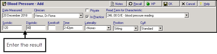 - Read Term for Characteristic - Defaults to 246..00 O/E - blood pressure reading select from the available list as required.