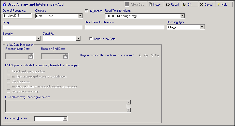 Where an adverse reaction to a drug, immunisation or device is diagnosed or suspected, the diagnosis or symptom should be recorded in the Drug Allergy and Intolerance Structured Data Area (SDA). You can also create a Yellow Card from here which electronically sends Yellow Card information to the MHRA. Where medication is changed because of an adverse reaction or side effects, the indication for any new drugs should be entered.