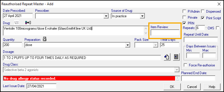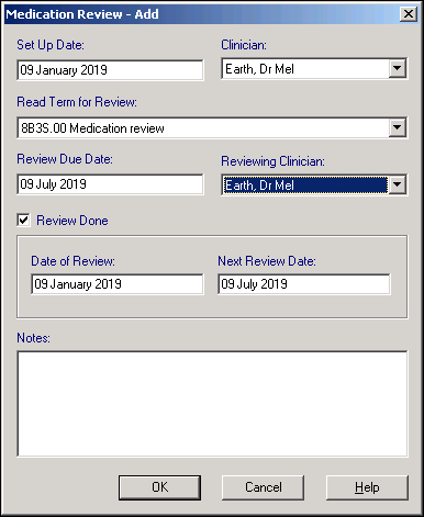 - Review Done - Ticked by default, indicating you have completed a Medication Reviews, and set a date for the next one. Remove the tick to indicate a review has yet to be completed.