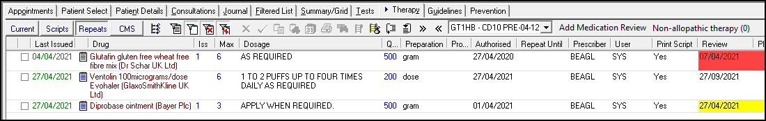 If you want to enter a date to review individual medication(s), you can add an Item Review date. The review date displays in a Review column on the Therapy tab and highlights in yellow when due and red when overdue.