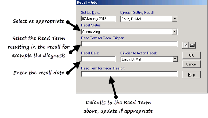 - Clinician Setting Recall - Defaults to the staff member or GP signed on for the current session, update as required.
