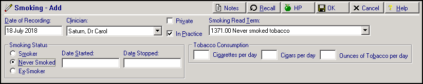See Smoking Read Terms and Associated Smoking Status for further details. - Date Started/Stopped - Enter dates if required