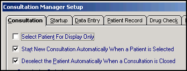 - Optional, if you are adding data, it is useful to set a Consultation to open and close automatically when you select and deselect a patient. Select the Consultation tab and tick Start New Consultation Automatically When a Patient is Selected and Deselect the Patient automatically when a consultation is closed: