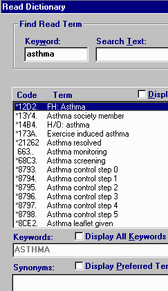 Clinical details are entered from the Read dictionary by either Keyword or Read code.