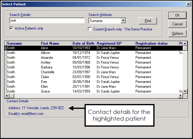 1. Locate the patient you require and either double click on them or highlight the patient required and select OK. Use the right horizontal scroll arrow to view further patient details off-screen on the right.